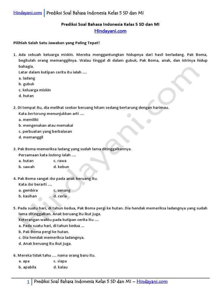 Prediksi Soal Bahasa Indonesia Kelas 5 SD Dan MI Hindayani.com